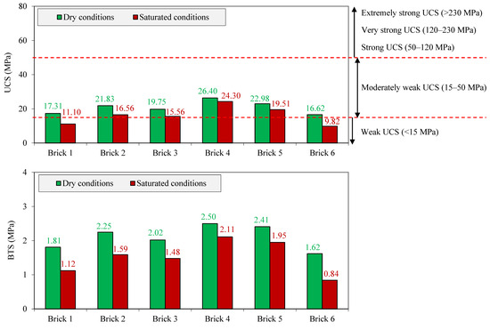 The samples were classified according to their UCS values using the classification suggested by the IAEG [40]. In this classification, construction materials are categorized into five strength classes including weak (UCS < 15 MPa), moderately weak (UCS 15–50 MPa), strong (50–120 MPa), very strong (120–230 MPa), and extremely strong (>230 MPa). Figure 7 shows that all samples under dry conditions were classified as bricks with moderately weak strength (UCS 15–50 MPa). For the samples under saturated conditions, bricks 2, 3, 4, and 5 were still in the class of moderately weak strength, while bricks 1 and 6, with a one-rank loss compared to dry conditions, fell into the class of construction materials with weak strength (UCS < 15 MPa).