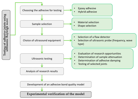 Adhesive joints are well known, but widespread use requires the evaluation of their quality. Quality assessment using destructive and non-destructive methods can be carried out. The first group of methods of testing adhesive joints are methods that allow us to determine the quality of the joint, but at the same time cause its destruction. These methods are relatively well understood and described in the literature [17,18,19]. The main methods of destructive evaluation of bonded joints are mechanical strength tests. The most widely used destructive method of testing adhesive joints is the determination of their shear and tensile strengths [20]. This group of tests allows the evaluation of both the properties of the adhesives and the appropriateness of the adhesive technology (surface preparation, adhesive preparation, conditions for manufacturing the joint and others).