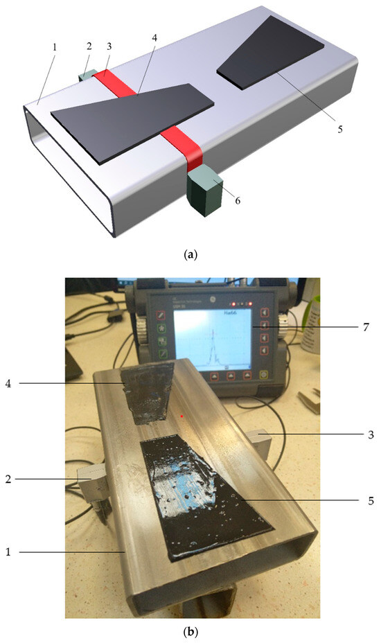Measurement system: (a) scheme: 1—closed profile of 120 × 40 × 4 mm; 2—transmitting head; 3—Rayleigh wave, 4—hybrid adhesive; 5—epoxy adhesive; 6—receiving head; 7—ultrasonic flaw detector, and (b) view of the measuring system.