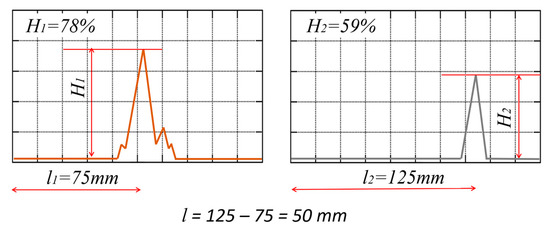 where H1, H2 are the percentage height (the amplitude value) of the pulse for two adhesive widths and l is the difference in distance between probes.