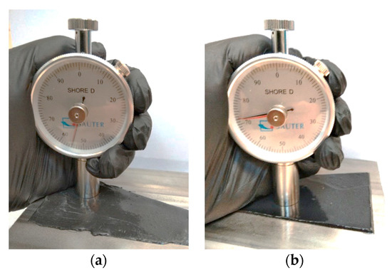 Hardness measurements: (a) hybrid adhesive, and (b) epoxy adhesive.