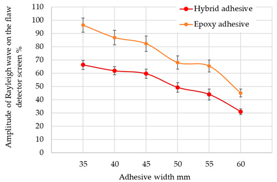 The results of the pulse amplitude’s average value obtained from the flaw detector screen, taking into account the adhesive path width, are shown in Figure 8. It can be seen that as the width of the adhesive path changes, the pulse height obtained on the flaw detector screen decreases.