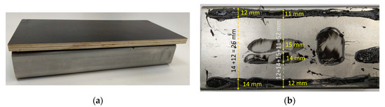 A particularly significant share of adhesive joints is observed in the automotive industry [9,10,11]. These joints are used in numerous applications in the manufacturing stage of cars, vans, trucks and buses (urban two axle, articulated and tourist buses). In the construction of passenger vehicles, bonding is used for fixing brake pad linings, joining windows and elements of the door, engine covers and the body panels. An equally significant share of adhesives in vehicle construction is observed in the production of buses [12]. During their construction, in addition to the parts mentioned above in passenger vehicles, the floor is also bonded to the frame, along with floor carpeting, plating, and side panels to the vehicle frame. Additionally, the front directional panel cover and rear wall, fuel filler caps and roof plating are bonded [13,14]. Such extensive use of bonding in the construction of buses is due to their considerable size and the vibrations generated during operation, which are well damped by adhesives. Adhesive joints in vehicle construction are often combined with welded [15], spot welded [16] or shaped joints, such as clinching [9]. Combining different joining methods speeds up production and increases the mechanical strength of the joint. A cross-section of the floor used in a bus construction manufactured using adhesive bonding is shown in Figure 1.