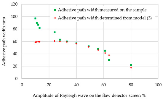 In the next step of the experiment, the determined relationship describing the dependence of the amplitude of the ultrasonic surface wave pulse on the width of the adhesive path was verified. For this purpose, a sample with different adhesive path widths was prepared, and is shown in Figure 9. The sample was made from a 120 × 30 × 4 mm steel profile with a length of 250 mm. This is the kind of profile that is used in the production of city buses. Hybrid glue was applied in such a way that there was a different width of the glue path. Then, such plywood as is used for the floor was applied. After the joint was constituted, measurements were taken using surface wave heads. After the measurements were completed, the plywood was separated from the glue and the width of the glue path was measured, which allowed verification of the model. Then, the ultrasonic Rayleigh wave pulse amplitudes were determined in different places of the sample and the width of the adhesive path was calculated using Equation (3). The values determined in this way were compared with the situation presented in Figure 10.