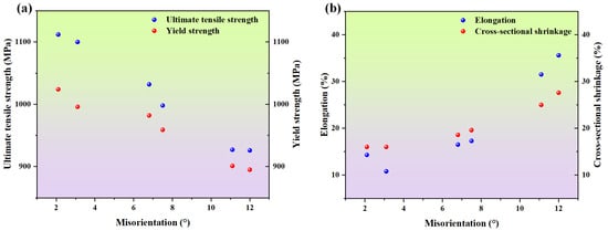 Tensile properties of single-crystal superalloy with different misorientation: (a) ultimate tensile strength (σb) and yield strength (σp0.2); (b) elongation (δ) and cross-sectional shrinkage (ψ).