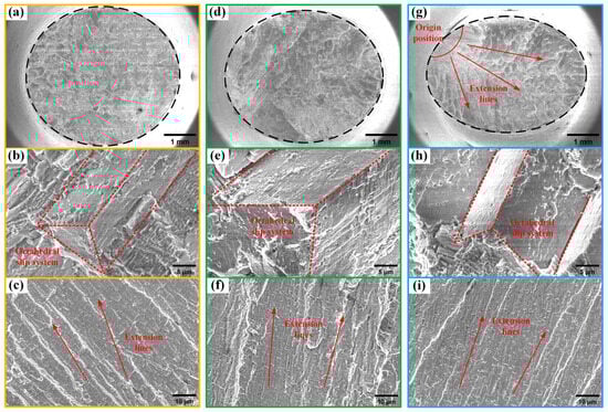 SEM morphology of fractures with different misorientations: overall fracture morphology, slip steps, extension lines of (a–c) L#—3° deviation from [001]; (d–f) M#—8° deviation from [001]; (g–i) H#—13° deviation from [001].