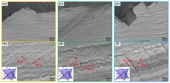 SEM morphology of slip lines on specimen surfaces with different misorientations: (a,b) L#—3° deviation from [001]; (c,d) M#—8° deviation from [001]; (e,f) H#—13° deviation from [001].