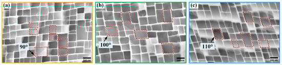 The cross-sectional microstructures near the fracture surfaces of samples with different deviation angles from the [001] direction were observed using SEM in the secondary electron mode, with a working distance of 10 mm and a voltage of 20 kV. Figure 6 displays the γ/γ′ phase morphologies near the fracture surfaces of the L#-, M#-, and H#-oriented samples with different deviation angles. The sample with an initial deviation angle of only 3° (L# orientation) retained its original cubic γ′ phase characteristics without noticeable torsional deformation after the tensile test. The sample with an initial deviation angle of 8° (M# orientation) exhibited torsional deformation of the γ′ phase, with a deformation angle of about 10°, while the sample with an initial deviation angle of 13° (H# orientation) showed even greater torsional deformation of the γ′ phase, about 20°. These observations correspond to the elliptical transformation of the cross-sections shown in Figure 4, indicating that the elliptical process of the cross-section is due to torsional deformation of the γ′ phase. This torsional deformation results from lattice rotation during asymmetric loading. The degree of lattice rotation increases with the increase in deviation angle, leading to a more pronounced degree of elliptical fracturing and distortion of the γ′ phase as the deviation angle increases.
