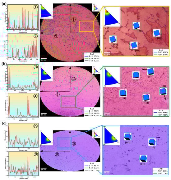 Low-angle boundaries (LABs) and orientation change analysis of the cross section near the fracture surface after the tensile test: (a) L#; (b) M#; (c) H# (3°, 8°, and 13° deviation from [001], respectively).