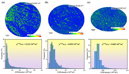 Kernel average misorientation and geometrically necessary dislocation analyses of the cross section near the fracture surface after the tensile test: (a) L#; (b) M#; (c) H# (3°, 8°, and 13° deviation from [001], respectively).
