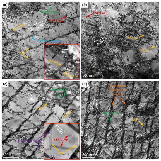 TEM was used to observe and analyze the dislocation configurations in the cross-sections near the fracture surfaces of samples with different deviation angles (L#, M#, and H#). The analysis results, shown in Figure 9, under the operating vector g = 002, the samples with L# orientation exhibit significant differences in dislocation density at different locations (as shown in Figure 9a,b). The dislocation density within the γ channels is lower, predominantly characterized by the cutting of the γ′ phase by superlattice stacking faults (SSFs). In regions of varying dislocation density, SSFs in both the [110] and [10] directions are observed, as indicated by the yellow arrows in Figure 9a,b. This suggests that at least two slip systems were activated during the tensile process of the L# orientation. SSFs are present not only in the γ′ phase but also in the γ matrix, marked by blue arrows in Figure 9a, due to the addition of refractory elements like Re and Co, which results in a lower stacking fault energy (SFE) and is generated by interface dislocations. Furthermore, SSF loops are visible within the γ′ phase, marked by red arrows in Figure 9a,b, surrounded by super partial dislocations. Figure 9c illustrates the micro-dislocation morphology of samples with M# orientation, showing a twisting deformation from rectangular to parallelogram shapes in the γ′ phase. Compared to samples with L# orientation, there is a noticeable increase in dislocation density within the γ channels, and a reduction in SSFs within the γ′ phase (marked by yellow arrows in Figure 9c), predominantly in a single direction, indicating that tensile deformation is primarily governed by one slip system. In addition, incomplete dislocations are present in the γ′ phase (marked by green arrows in Figure 9c), along with curved dislocations (marked by purple arrows in Figure 9c). Figure 9d reveals the micro-dislocation morphology of samples with H# orientation, where the twisting deformation in the γ′ phase is more severe compared to L# and M# orientations, and a large number of tangled dislocations are visible within the γ channels (marked by orange arrows in Figure 9d), a result of lattice rotation. The density of dislocations cutting into the γ′ phase significantly increases, mainly comprising a large number of incomplete dislocations (marked by green arrows in Figure 9d) and a few SSFs (marked by yellow arrows in Figure 9d). These dislocations and stacking faults participate in the tensile deformation process of specimens with high deviation angles.