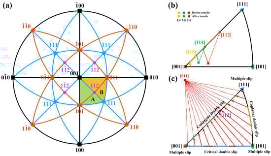 (a) The standard [001] stereographic projection. (b) The lattice rotation path of different misorientations during RT tensile deformation. (c) Illustration of lattice rotation in a standard stereographic triangle under {111} <110> slip.
