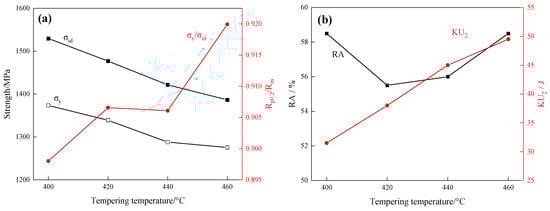 The XRD result is shown as depicted in Figure 9a. As tempering temperature rose, there was a gradual reduction in dislocation density within the 40CrNi2MoE steel. This phenomenon can be attributed to the release of residual stresses during the tempering process. By alleviating the resistance to dislocation movement, this stress release facilitated increased dislocation annihilation and subsequently caused a decline in dislocation density [35]. Concurrently, as the tempering temperature rises, a marginal portion of the martensitic phase undergoes an inverse transformation, giving rise to the formation of reverse-transformed austenite. The higher cubic symmetry and atomic packing density of the austenite lattice structure made it more susceptible to dislocation slip, resulting in a further decrease in dislocation density.
