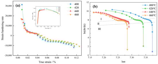 In Equation (1), k is a material constant, while n denotes the exponent characterizing strain hardening. The construction of the curve is synonymous with the generation of the modified Crussard–Jaoult (C–J) analysis plot [27,28]. The real strains at distinctive junctures within this plot are denominated as transition strains, εt.