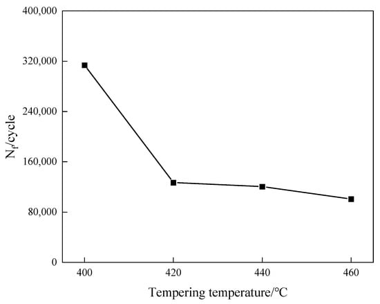 To investigate the influence of diverse tempering temperatures on the rotating bending fatigue life of 40CrNi2MoE steel, rotational fatigue examinations were executed on smooth experimental specimens subjected to tempering procedures at varying temperatures. The test parameters have been given at the front, and the maximum stress is 800 MPa. The outcomes are delineated in Figure 6, which illustrates the fatigue life’s dependence on tempering temperature in the examination of the trial steels. Notably, within the experimental temperature spectrum, specimens undergoing tempering at 400 °C manifested the most elevated fatigue life, attaining 313,763 cycles. Additionally, with escalating tempering temperatures, a conspicuous decrement in fatigue life ensues, comporting harmoniously with the concurrent trend in strength variation. This concordance illustrates that the factors governing fatigue life are consonant with the determinants of strength.