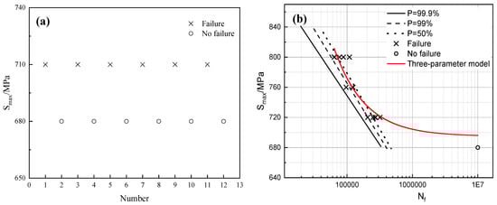 (a) Staircase plot; (b) P-S-N curves of 40CrNi2MoE steel and three-parameter model fitting curve.