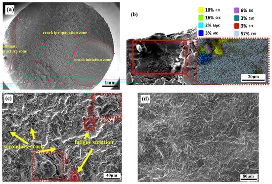 The fatigue fracture surfaces resulting from rotational bending fatigue present a wealth of valuable information regarding the fracture process. Characteristically, these fatigue fracture surfaces manifest three discernible morphological domains: the fatigue crack origin region, the crack propagation region, and the fatigue final rupture region. Conventionally, the final rupture region is positioned diametrically opposite the origin region. However, due to the accelerated advancement in fatigue cracks in the reverse rotational direction, the location of the rupture region deviates at a certain angular offset in the reverse rotation direction, as elucidated by previous research [34]. The intermediate plane strain region exhibits a radial pattern, as illustrated in Figure 8a. Upon an examination of the fatigue fracture surfaces exhibited by 40CrNi2MoE steel subjected to rotational bending fatigue, a notable revelation emerged: all fatigue cracks originated exclusively from the specimen’s surface. This phenomenon can be ascribed to the persistent oscillation of tensile and compressive stresses, which act upon multiple points of the specimen’s surface in a sinusoidal fashion, thereby culminating in the highest stress amplitude at the surface. Furthermore, the primary origins of crack initiation are traced back to the presence of inclusions, specifically, slag inclusions, and processing defects. These inclusions encompass a blend of Al2O3, CaO, and MgO, in composite arrangements of two or more constituents, as distinctly delineated in Figure 8b. It is noteworthy that no cracks were initiated solely as a consequence of one kind of inclusion during the fatigue tests. The level of control of inclusions in the steelmaking process needs to be improved.