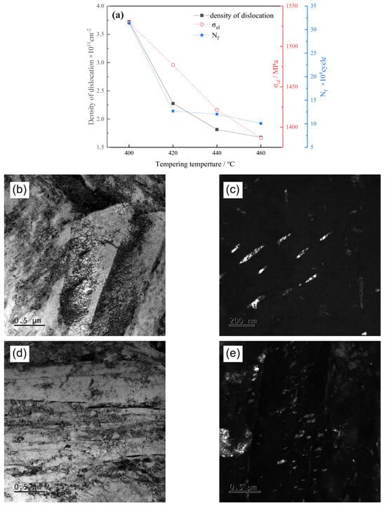 (a) Density of dislocation vs. tempering temperature; (b,c) BF and DF of dislocations and cementite inside lath after tempering at 400 °C, respectively; (d,e) BF and DF of dislocations and cementite inside lath after tempering at 460 °C, respectively.