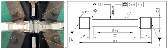 The commercial Ti-6Al-4V alloy with a diameter of 20 mm suffered the vacuum annealing process for 1 h at a temperature of 780 °C. Subsequently, it was allowed to cool down to ambient temperature in the natural environment. Figure 1 illustrates the original microstructure of Ti-6Al-4V, which consists of equiaxed primary α phase and transformed β phase. The chemical composition of the Ti-6Al-4V workpiece is listed in Table 1. In order to obtain the yield strength of the original workpiece, quasi-static tensile tests were carried out at room temperature (25 °C) on the tensile test machine (WDW-100, Changchun Kexin Test Instrument Co., Changchun, China). Figure 2 shows the shape of the tensile test specimen. The specimen was fixed in the tensile test machine. An axial tensile load was applied on both ends of the tensile specimen at a strain rate of 0.01 s−1. The yield strength of the original workpiece was 1.05 GPa, which could be obtained from Figure 3.