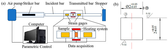 Structural schematic of Hopkinson pressure bar experiment platform (a) and the size of the sample (b).