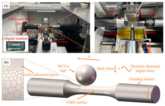 Titanium alloys fulfill the need for lightweight, high-strength, and corrosion-resistant material for modern manufacturing. As a result, the demand for titanium alloy has been increasing in aerospace [1,2], marine [3,4], and biomedical fields [5,6]. During the service period of titanium alloy components under complex conditions, fatigue failure is one of the main reasons for inducing damage and fracture of the components, which could result in serious consequences [7]. Numerous studies have shown that surface strengthening methods have the potential to enhance the fatigue life of key components. The surface strengthening methods for practical engineering applications mainly consist of shot peening [8], laser shock peening [9], and ultrasonic surface rolling process [10]. Shot peening has been commonly applied in scientific research and manufacturing because of its cost-effectiveness and suitability for processing complex-shaped components. By forming a residual compressive stress layer and a gradient layer on the material surface after shot peening, the fatigue performance of components was significantly improved. However, due to the randomness of the shot peening processing with many shots projected on the material, the formation of the residual compressive stress layer could be uneven distribution, and the surface quality could deteriorate. Laser shock peening involves using a high-energy laser beam to act on an absorbing layer attached to the surface of the workpiece material. This process generates a high-temperature, high-pressure plasma that causes localized expansion and explosion. The high-energy shock wave formed by localized expansion and explosion could operate on the workpiece surface under the constraint of a confinement layer. However, the pre-processing stage of the practical laser shock peening process is relatively complicated. Furthermore, the overall price of the laser shock strengthening equipment is very high, which leads to higher manufacturing costs. In contrast to the two strengthening techniques mentioned above, the ultrasonic surface rolling process (USRP) was characterized as the coupled influence of static force and dynamic ultrasonic impact force applied on the workpiece. The plastic deformation of the workpiece could be facilitated by an ultra-high-frequency (≥20 kHz) vibratory impact of the rolling ball, and the strain rate could achieve 102 s−1 to 103 s−1 during this condition [11]. Simultaneously, the homogeneous surface deformation could be attributed to the rotational movement of the processed material [12]. USRP could significantly decrease the surface roughness and raise the geometrical precision of the machined surface, thus greatly enhancing the machining quality. Additionally, USRP could promote the development of a gradient structure with the compressive residual stress field and work-hardening layer. Currently, USRP has effectively been utilized to enhance the fatigue properties of a variety of aerospace metals [13,14,15], especially titanium alloys.