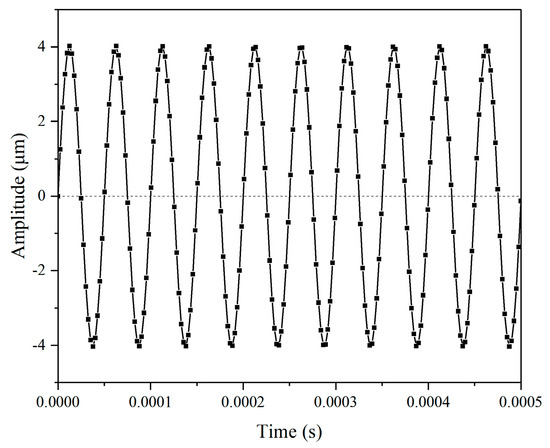 To prepare the Ti-6Al-4V alloy sample for USRP treatment, the turning process was performed with a cutting speed of 60 m/min, a feed rate of 0.05 mm/r, and a cut depth of 1 mm. Subsequently, the grinding process was performed with the wheel speed of 2000 r/min, workpiece rotation speed of 120 r/min, feed rate of 0.05 mm/r, and grinding depth of 0.05 mm. The dimension of the fatigue sample is shown in Figure 5. The USRP experimental setup and schematic of the USRP process are displayed in Figure 6. Table 3 presents the basic USRP parameters. The rolling ball was propelled by the ultrasonic vibration system, which was employed to strike the workpiece surface during USRP. A force sensor was mounted between the ultrasonic impact device and the spring device. The static force applied on the workpiece surface could be adjusted by controlling the compression length of the spring. The value of static force, which is measured by the force sensor, is displayed on the digital monitor. As shown in Figure 7, the ultrasonic amplitude of the rolling ball is 4 μm, which could be measured by the laser displacement sensor (NLV-250, Ploytec Measurement Technology Co., Waldbronn, Germany). To guarantee the dependability of experimental data, a minimum of three samples were processed in each situation.