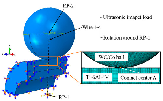 The USRP was simulated by the ABAQUS/Explicit Finite element software (ABAQUS 2020), and the finite element model was established, as shown in Figure 8. The model of the workpiece was configured as a quarter of the hollow bar with an outer diameter of 20 mm and an inner diameter of 4 mm. The mesh size of the contact region between the rolling ball and the workpiece surface was refined to 50 μm × 50 μm for the purpose of minimizing computation time. The mechanical and thermal properties of the rolling ball are shown in Table 4. The elastic modulus of the rolling ball was much larger than the Ti-6Al-4V alloy, thus defining the rolling ball as an un-deformable rigid body. The thermo-physical properties of the rolling ball and the friction coefficient between the cemented carbide rolling ball and the Ti-6Al-4V workpiece could affect the temperature in the contact area during USRP. The friction coefficient between the WC/Co cemented carbide and Ti-6Al-4V was measured as 0.3 [32]. The other simulation settings were as follows: (1) Setting reference point 1 (RP-1) and reference point 2 (RP-2) at the center of the workpiece and the center of the rolling ball, respectively; (2) Creating a coupling constraint between the workpiece and RP-1; (3) Fixing the reference point 1 (RP-1) completely; (4) Setting a line constraint (Wire-1) between RP-1 and RP-2. An ultrasonic impact load was applied to Wire-1, which consisted of the static load and dynamic ultrasonic impact loads. The line constraint (Wire-1) rotated around RP-1. The simulation parameters were consistent with the parameters of the actual USRP test in Table 3; (5) Node A was placed in the center of the contact area, which was used to assess the evolution of the temperature and strain rate of the workpiece during USRP. Moreover, the J-C model was selected to describe the mechanical properties of Ti-6Al-4V, which was defined as follows: