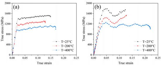 The true stress–strain curves of Ti-6Al-4V under various temperatures and strain rate: (a) strain rate of 2000 s−1; (b) strain rate of 4000 s−1.