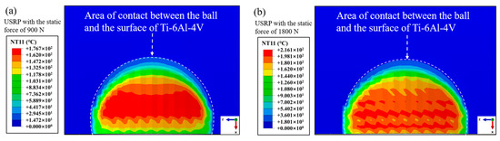Figure 11 displays the surface temperature field in the contact region between the rolling ball and Ti-6Al-4V workpiece under USRP with various static forces. It was found that the temperature in the center of the contact region could reach 176 °C and 216 °C when the USRP parameter of static force was 900 N and 1800 N, respectively. This could be due to the frictional heating and plastic deformation work between the rolling ball, and the workpiece was converted to thermal energy, which led to the increase in temperature in the contact area. The strain rate of deformation in the center of the contact region between the rolling ball and Ti-6Al-4V workpiece under USRP treatment with various static forces is shown in Figure 12. It was observed that the strain rate of deformation in the center of the contact region could reach 2157 s−1 and 4215 s−1 when the USRP parameter of static force was 900 N and 1800 N, respectively. The coupling effect of the static force and dynamic ultrasonic impact force during USRP treatment could result in high instantaneous velocity and acceleration at the tip of the rolling ball, which could lead to severe plastic deformation of the workpiece.