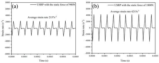The evolution of strain rate in the center of contact region under USRP treatment with different static forces: (a) static force of 900 N; (b) static force of 1800 N.