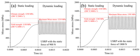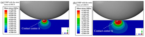 The Mises stress under USRP treatment at different static forces: (a) static force of 900 N; (b) static force of 1800 N.