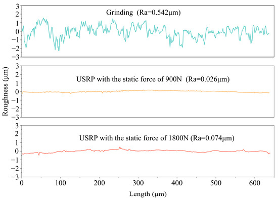Figure 16 presents the comparison of the surface roughness value of the Ti-6Al-4V workpiece after grinding and USRP treatment. The surface roughness value of the Ti-6Al-4V workpiece after grinding was 0.542 μm, which was effectively reduced to 0.026 μm after USRP reached the static force of 900 N. However, the surface roughness value of the workpiece increased to 0.074 μm after USRP reached the static force of 1800 N. The decline in surface roughness of the Ti-6Al-4V workpiece by using USRP treatment could contribute to preventing the occurrence of fatigue cracks, thereby enhancing the fatigue resistance of the workpiece.