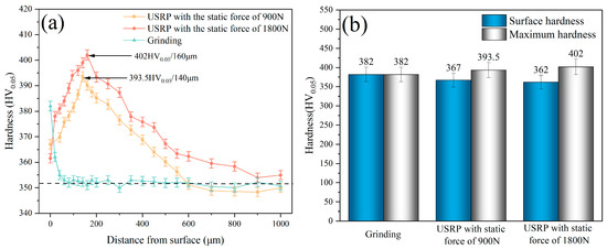 Figure 18 illustrates the hardness distribution of the Ti-6Al-4V workpiece after grinding and USRP treatment. The hardness of the Ti-6Al-4V matrix was 353 HV0.05. The surface of the original workpiece suffered plastic deformation and hardening after grinding. This led to an increase in the maximum hardness to 382 HV0.05, and the maximum hardness value appeared at the workpiece surface. The trend of hardness value from the machined surface to the subsurface layer after grinding decreased. The depth of the work hardening layer was approximately 40 μm. Figure 18a illustrates the hardness distribution from the machined surface to the subsurface layer after USRP with different static forces. The maximum hardness could reach 393.5 HV0.05 after USRP treatment with the static force of 900 N, which was 11.47% higher than the matrix hardness. The depth of maximum hardness value was about 140 μm. The maximum hardness could reach 402 HV0.05 after USRP treatment with the static force of 1800 N, which was 13.88% higher than the matrix hardness. The depth of maximum hardness value was about 160 μm. This was attributed to the increase in the static force, which led to a greater level of plastic deformation behavior on the workpiece surface. The trend of hardness distribution in the cross-section of the workpiece after USRP was shown to increase at first and then decrease to the matrix hardness. In addition, according to the Hertz contact principle, the maximum strain in the subsurface layer of the workpiece after USRP could occur below the surface [34]. This could be associated with the maximum hardness value appearing at the subsurface of the workpiece after the USRP treatment.