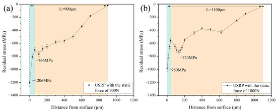 The distribution of residual stress after USRP with different static forces: (a) static force of 900 N; (b) static force of 1800 N.