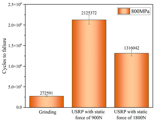 The fatigue life of the Ti-6Al-4V workpiece after grinding and USRP treatment was evaluated at fatigue stress of 800 MPa during the rotational bending fatigue tests, as shown in Figure 20. As for the Ti-6Al-4V workpiece, after grinding, the fatigue life reached about 272,591 cycles at a stress level of 800 MPa. After USRP treatment with the static force of 900 N, the fatigue life reached about 2,125,372 cycles at fatigue stress of 800 MPa, which improved by about 7.8 times in fatigue performance compared with the grinding workpiece. After USRP treatment with the static force of 1800 N, the fatigue life reached about 1,316,042 cycles at fatigue stress of 800 MPa, which improved by about 4.82 times in fatigue performance compared to the grinding workpiece. It could be observed that the fatigue life of the Ti-6Al-4V workpiece after USRP treatment with the static force of 1800 N was lower than that of USRP with the static force of 900 N. This could be due to the formation of better surface integrity and greater residual compressive stress after USRP treatment with the static force of 900 N. Nonetheless, it could be concluded that the fatigue life of the Ti-6Al-4V workpiece after USRP treatment was greatly improved compared with the fatigue life of the workpiece after grinding.