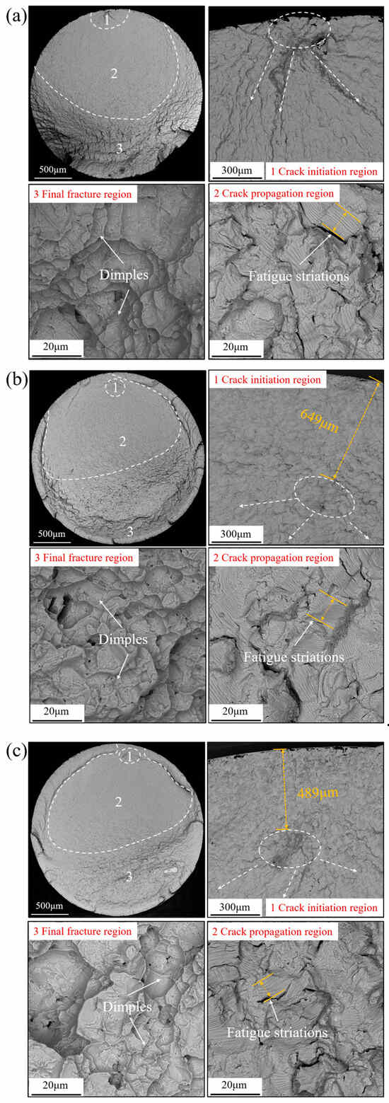 The fracture morphologies of the Ti-6Al-4V workpiece after fatigue tests with different processing methods under the fatigue stress of 800 MPa are shown in Figure 21. The fatigue fracture image could be classified into three distinct regions: crack initiation region (Region 1); crack propagation region (Region 2); and final fracture region (Region 3). Figure 21a shows the fatigue fracture diagram of the workpiece with grinding treatment. It could be observed that the fatigue crack source area appeared at the workpiece surface. Microcracks appeared near the fatigue source in the crack initiation region (Region 1), which could be attributed to the crack propagation region (Region 2). It could be noted that the dimples were captured in the final fracture region (Region 3), which indicated that the ductile fracture behavior occurred. Figure 21b shows the fatigue fracture diagram of the workpiece after USRP with a static force of 900 N. It could be observed that the fatigue crack source area appeared at a distance of about 649 μm below the workpiece surface. This could be associated with the formation of the great residual compressive stress field in the workpiece subsurface after USRP, which could contribute to the inhibition of the crack propagation to the workpiece surface. Similarly, the microcracks and dimples could be found in the crack propagation region and the final fracture region, respectively. Figure 21c shows the fatigue fracture diagram of the workpiece after USRP with a static force of 1800 N. The fatigue crack source area appeared at a distance of about 489 μm below the workpiece surface. By increasing the static force of USRP from 900 N to 1800 N, it was observed that the distance between the fatigue fracture source and the workpiece surface decreased significantly, which could have a negative influence on the fatigue resistance properties of the workpiece. The fatigue crack was initiated at the defective locations and propagated by the tensile stress. The formation of a greater residual compressive stress field after USRP with the static force of 900 N could promote the fatigue crack source being transferred to the deeper position of the workpiece. In contrast, the excessive static force of 1800 N applied on the workpiece could induce damage failure and eliminate the beneficial effect of USRP treatment. This indicates that the selection of the appropriate processing parameters for USRP treatment is very critical.
