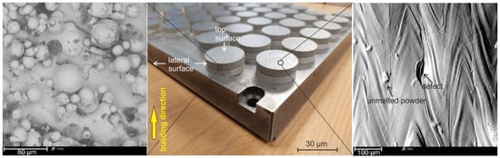 where the symbols are as follows: energy input per volume (E), energy density (J/mm2), P, laser power (W), V, scanning, speed (mm/s), t, layer thickness (mm), h, hatch spacing (mm). Nitrogen was used as a shielding gas during fabrication. The obtained specimens were in the shape of disks, with a diameter of 30 mm and a height of 6 mm. A parallel scan strategy with an alternating scan direction was adopted, and for the successive layers, the scanning direction was rotated at a 90° angle. The fabricated specimens were built horizontally orientated. The as-built parts were subjected to a stress-relieving annealing at 650 °C for 1 h in an argon atmosphere (Ar). The heat treatment process was carried out for the matrix together with the specimens in a Nabertherm GmbH (Lilienthal, Germany) model N41/H chamber furnace dedicated to annealing after sintering. The orientation of the print can affect the microstructure and mechanical properties of fabricated components of 17-4PH steel [29,30]. Therefore, in our case, the samples were fabricated in repeatable conditions, as shown in Figure 1. After manufacture, the test material was cleaned in an ultrasonic cleaner and then air dried with compressed air. Although the disks were printed according to the optimal parameters recommended by the manufacturer EOS, they bore surface defects typical for this additive method. Figure 1 shows the design of the resulting discs, highlighting the top and lateral surfaces. SEM images revealed the minimal presence of unmelted powder particles along with satellites and impurities on the lateral surface. The top surface revealed dimple defects (which are formed by the welding pool’s collapse) and not entirely melted powder particles along the splashes. Half-overlapping laser paths and scales resulting from the cooling of the weld pool were also revealed. Therefore, such surface characteristics of the obtained specimens further justify the need for shot peening treatment, which is a commonly applied procedure for additively manufactured components [31].