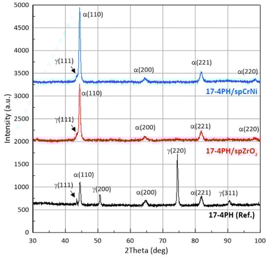 A similar result was obtained by Michela et al. [38]; only the initial samples had a more martensitic structure. This was evident in the absence of distinct peaks from austenite and high hardness after peening. In turn, Wang et al. [39] used a two-stage shot peening using cast iron balls and then ceramic balls with a hardness above 700 HV to determine the effect of the SP process on the phase composition of conventional 17-4PH steel. The research compared the surfaces of the matrix and the laser-hardened layer, where the SP process was carried out with large-diameter spheres (1 mm and 0.1 mm). It was found that SP induced the transformation of austenite to martensite, as evidenced by the disappearance of the austenite peaks in the XRD profile. Moreover, the shift of the martensite peak positions was less than 0.1°. Changes in grain size, micro-strains, and dislocation density were also observed. Similarly, Eskandari et al. [40] confirmed a strain-induced phase transition of austenite to martensite.