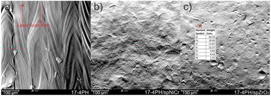 SEM imaging in topographic mode allowed for the visualization of the surface both before and after the peening process (Figure 5). The surface visible on the left immediately after fabrication was characterized by overlapping traces of the laser beam passage indicated by red arrows in Figure 5a, above which “splashes” and not surfaces after SP using ceramic beads can be easily distinguished, as smaller irregularities characterize it, while they are full of craters and dents caused by the impact of particles of both spherical and irregular shape. The irregular shape of some depressions is due to the fragmentation of the peening medium. The localization of the bead medium particles in the surface was also observed, in accordance with the Kameyama and Komotori model [41]. The presence of fixed peening medium particles was also confirmed for the ZrO2 peened sample using EDS. However, the presence of CrNi steel particles is difficult to confirm using EDS, and this is due to the similar elemental composition to peened 17-4PH steel.