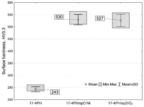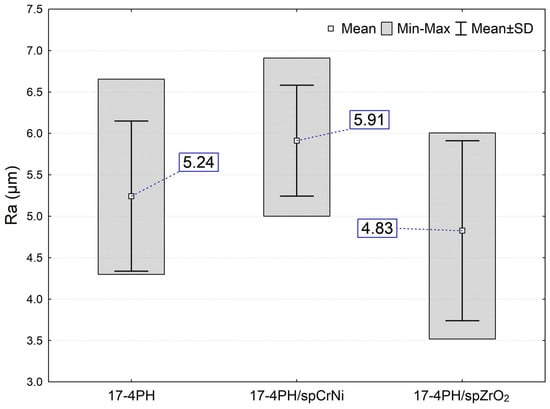The results from the roughness (Figure 6) corresponded with the SEM observations of the surfaces. The treatment with ZrO2 ceramic beads shows a smoother surface, and the lowest values of the roughness parameter Ra were recorded for these surfaces. In contrast, the treatment of CrNi steels with a shot causes much greater plastic deformation and an increase in roughness even relative to the reference surface. At the same time, it should be bore in mind that this result for the 17-4PH/spCrNi sample was obtained at almost twice the size of the peening medium (vs. ZrO2). Comparing roughness with respect to the as-printed surface, there is an increase of 12.8% in the Ra parameter for the surfaces treated with CrNi steels and a decrease of 7.8% for the surfaces treated with ceramic beads. Overall, the DMLS horizontally built material exhibits a significantly rougher texture than wrought steel. According to the research by Mower and Long [42], Sa for laser-sintered surfaces is 3–5 μm. In turn, the magnitude of peened surface roughness depends primarily on the type, size and geometry of the shot, which has already been confirmed in research studies [43,44]. Dorr et al. [43] (for a shot size in the range of 300–600 µm) and also Aymen et al. [44] (for shot size in the range of 125–450 µm) found a proportional increase in surface roughness associated with the use of a larger-size shot.