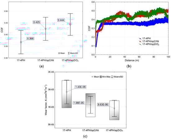 The results of the wear sliding tests in 0.9% NaCl solution are presented in Figure 8. The observed lower values of the coefficient of friction (COF) for the reference samples are due to the presence of unmelted grains (see Figure 1) after the laser sintering process of metal powder, and the COF itself appears almost stable over the entire route. Slightly higher average COF values were observed for the treated surfaces, with no statistically significant differences. The COF for the surface peened with CrNi shot was slightly lower compared to the surface treated with the ceramic balls. This situation can be explained by the higher surface roughness of the CrNi shot peened surfaces. In turn, higher surface roughness results in tip shear and film lubrication effects at the initial stage of the tribological test. Despite similar COF performances at distances up to about just 30 m (Figure 8b), significantly lower values were recorded for sample 17-4PH/spCrNi compared to 17-4PH/spZrO2. In addition, the higher COF values generated for 17-4PH/spZrO2 can be explained by the residual hard ceramic particles embedded in the surface layer, which are a natural obstacle to the counterbody [23,41].