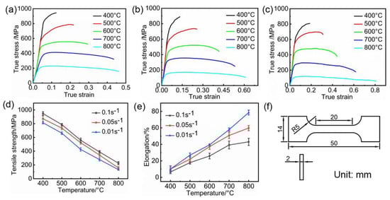 (a) Flow stress curves at strain rate of 0.1 s−1; (b) flow stress curves at strain rate of 0.05 s−1; (c) flow stress curves at strain rate of 0.01 s−1; (d) tensile strength at different temperatures and strain rates; (e) elongation at different temperatures and strain rates; (f) the size of tensile specimen.