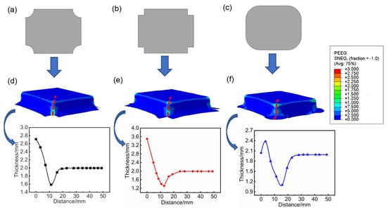 In the hot stamping process of titanium alloy, the rapid temperature fluctuations and significant material hardening in the later stages of deformation often pose a risk of cracking. To address this issue, crack stop incision was strategically designed at the four corners of the blank. The Coulomb friction model was adopted for describing the friction between the blank and dies, and the friction coefficient was set to 0.35 [24,25]. Figure 5a–c depict three common crack stop incision shapes. Implementing the corresponding designs for crack stop incision in the hot stamping process resulted in the distribution of equivalent plastic strain and the thickness of the formed component (highlighted by the red dashed lines in Figure 5). The findings indicate that the shape of the crack stop incision significantly influences the forming quality of the blank. Furthermore, the formed components display varying degrees of thinning in the connection area between the sidewall corner and the bottom of box. It is evident that the design presented in Figure 5a yields the best forming quality for the blank, while the maximum thinning rates for the formed components of the other two shapes reach as high as 34.5% and 44.2%, respectively, rendering those sheets unformable. Simulation results of the equivalent strain distribution reveal distinct differences in strain distribution at the side wall corner position for blanks with different shapes. In Figure 5d, the strain is primarily concentrated at the entrance fillet, indicating good forming quality at the connection between the sidewall corner and the bottom. In contrast, in Figure 5e,f, the equivalent plastic strain is highest in the connection area between the side wall corner and the bottom, suggesting this is a weak point in the forming process. This is attributed to the fact that, during the stamping process, the crack stop incision depicted in Figure 5a is the most conducive to material flow. However, at this juncture, the minimum thickness of the formed component is 1.586 mm. Typically, the thinning ratio of a titanium alloy sheet in hot forming should be controlled within 20%. Therefore, there is a perceived risk of rupture in the formed component, necessitating the further design of process parameters to ensure the high quality of the formed component.