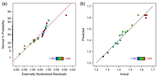 To further verify the accuracy of the fitted equations, diagnostic plots are generated as shown in Figure 6. Figure 6a shows the diagnostic plot of the normal distribution of residuals, and the data points are uniformly distributed on both sides of the diagonal line, manifesting that the fitting results obey a normal distribution. Figure 6b shows the distribution of predicted and real values, and the actual values are basically distributed in a straight line, showing that the predicted values basically match the actual values [32].