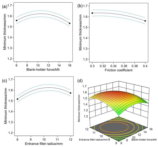 To delve deeper into the individual factors influencing thinning, Figure 7a–c illustrate the impacts of entrance fillet radius, blank-holder force, and friction coefficient on the minimum thickness R of the components. From Figure 7b, it is evident that the minimum thickness of the formed component decreases with an escalation in the friction coefficient. This phenomenon is ascribed to the higher friction coefficient, which results in an augmented adhesive friction between the blank and dies. Consequently, it hinders the flow of the blank into the die gap during deformation, leading to more pronounced thinning during the final forming stages. Figure 7a,c demonstrate that as the blank-holder force and entrance fillet radius increase, the minimum thickness of the formed component initially rises before subsequently decreasing. Therefore, the interaction between blank-holder force and entrance fillet radius on minimum thickness can be predicted using response surface methodology, as shown in Figure 7d.