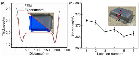 Based on the optimized process parameters obtained from the above procedure, a hot stamping experiment was conducted on a Ti6Al4V alloy sheet. The sheet was placed in a heating furnace, heated to 850 °C, and then held at this temperature for 2 min to ensure uniform temperature distribution throughout. After heating, it was quickly transferred to the room-temperature dies and then stamping was carried out at a speed of 50 mm/s. The formed component was cut along the section shown in Figure 8a using an EDM wire cutting machine (DK7750, Taizhou Borgman Machinery Equipment Co., Ltd., Taizhou, China). Along the cut section, we measured the thickness at intervals of 5 mm using a vernier caliper and compared the measurements with simulation results. The results demonstrate a close correlation between the thickness of the formed components and the simulation results, validating the accuracy of the simulation process. The thickness curve of the component shows some portions higher than the original thickness of the sheet. This is because wrinkling occurs at the entrance fillet of the sheet metal. However, since the entrance fillet and flange will be cut off in subsequent processing, it does not affect the forming quality of the box-shaped component. In order to obtain the hardness data at different locations of the formed component, six samples were cut sequentially from different locations of the formed component and tested for hardness, the sampling locations and sequence are shown in Figure 8b. Further analysis reveals variations in hardness at different positions of the formed components, with higher hardness in the flange section and relatively uniform hardness distribution in the sidewall and bottom of the box-shaped component.