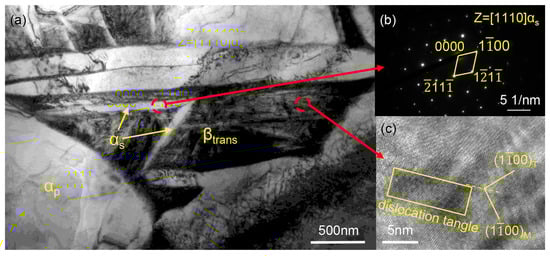 TEM micrograph of Ti6Al4V alloy after hot stamping: (a) BF image; (b) SAED corresponding to secondary α phase; (c) HRTEM image of typical transformed β phase.
