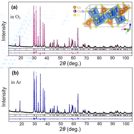 Graphical results of Rietveld refinement of the structure of (Ga1−xInx)2O3 samples synthesized in oxygen (a) and argon (b) atmospheres. Experimental XRD patterns (small black circles) are shown in comparison with a calculated pattern for β-Ga2O3 structure (pink and blue lines). Short vertical bars indicate the positions of Bragg’s maxima in the β-Ga2O3 structure. The inset shows polyhedral representations of the structure showing mixed occupancy of octahedra with Ga and In atoms in (Ga1−xInx)2O3 samples.