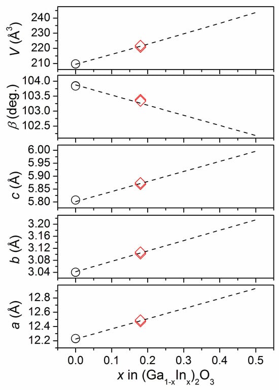 Evolution of the lattice parameters and unit cell volume vs. indium content in (Ga1−xInx)2O3 solid solution. Dashed lines represent linear fits performed by [11] for five data sets for the powder and single crystal (Ga1−xInx)2O3 materials taken from Refs. [25,27,30,31,32]. Unit cell dimensions of the nominally pure β-Ga2O3 [33] and two (Ga1−xInx)2O3 samples studied in the present work are shown by circles and red diamonds, respectively.