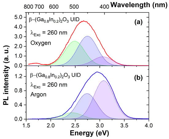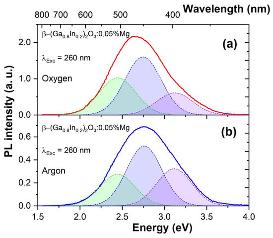 Photoluminescence spectra of β-(Ga0.8In0.2)2O3:0.05%Mg ceramics synthesized in oxygen (a) and argon (b) atmospheres. The elementary Gaussian peaks represent green, blue, and violet emission bands.